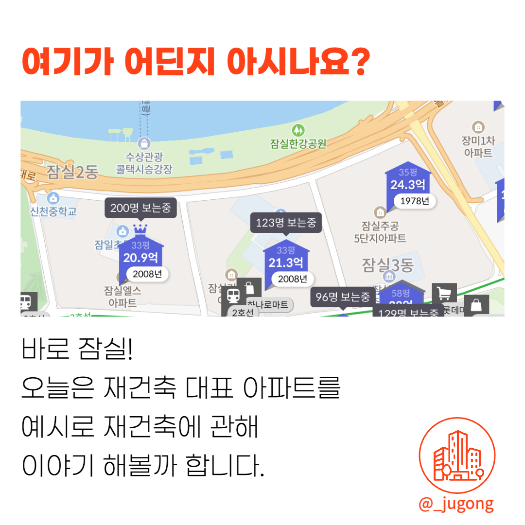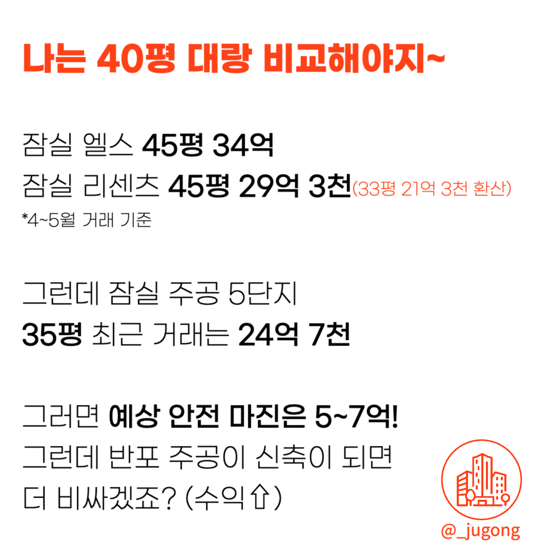 잠실 엘스 45평 아파트는 34억, 잠실 리센츠 45평 아파트는 29억 3천입니다. 그런데 잠실 주공 5단지 35평 아파트는 최근에 24억 7천에 거래되었어요. 잠실 주공이 재건축되면 그 가격은 더 올라갈 것입니다!
