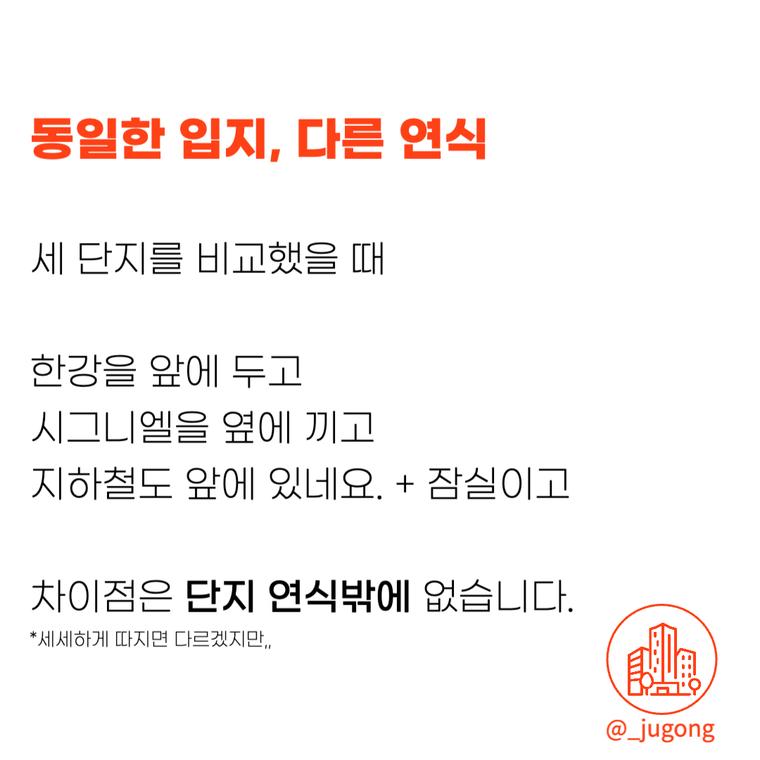 두 아파트 단지 모두 한강이 가까이 있고, 시그니엘 호텔도 옆에 위치해 있어요. 그리고 지하철도 바로 앞에 있어 교통이 편리하죠. 잠실이라는 좋은 위치인데, 차이점은 주로 아파트의 연식뿐입니다. (물론 세부적으로는 다른 차이점들도 있겠지만요!)