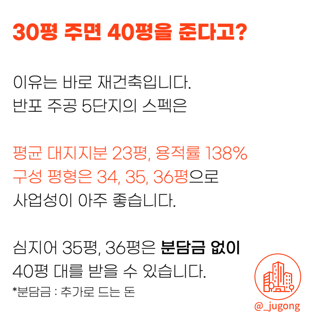왜 더 오래된 아파트가 더 비쌀까요? 그 이유는 재건축 때문입니다! 재건축을 예로 들면, 반포 주공 5단지는 평균 대지지분이 23평, 용적률은 138%로 구성 평형이 34, 35, 36평입니다.