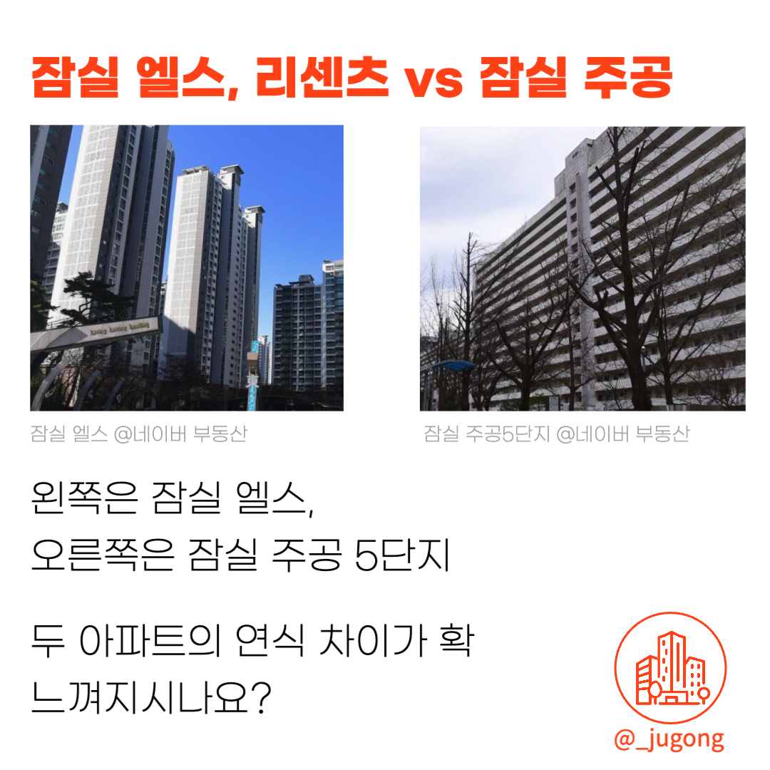 사진을 보면 왼쪽에는 잠실 엘스 아파트가, 오른쪽에는 잠실 주공 5단지 아파트가 있습니다. 두 아파트를 비교하면 연식 차이가 확연히 느껴지죠?